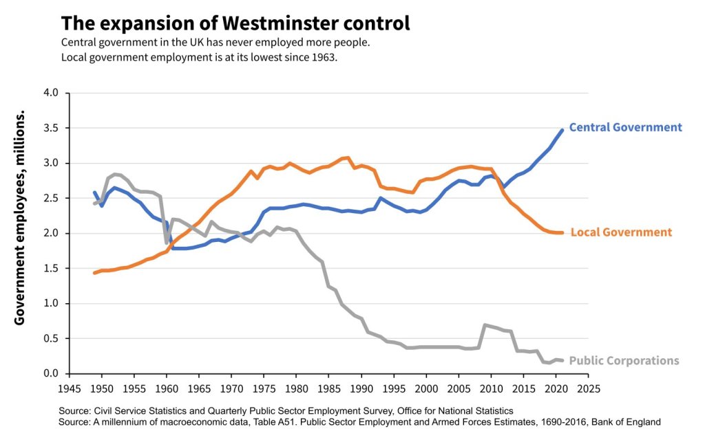 Local government staff numbers have fallen by a third since 2010 whilst central government has grown by almost the exact same number. For a government which has localism as one of its core policy aims this does not seem sustainable. But simply constantly moving functions between central and local government does not seem a sustainable way of making savings or delivering outcomes.
